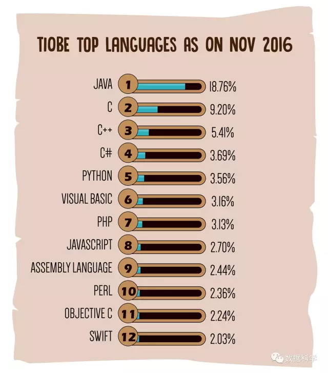 TIOBE 编程社区索引由荷兰 Eindhoven 的 TIOBE 公司创立和维护。TIOBE 代表着“真诚的重要性”,该索引将每项语言作为关键字,按照搜索引擎的查询数量对语言进行排名。因为 TIOBE 只索引图灵完全的语言,因此 SQL 和 HTML 没有考虑在内。2016年11月的排名结果显示,Java 依然是最受大家欢迎的语言,C 和 C++ 排名紧随其后。出人意料的是,Visual Basic 和 Python 排名有大幅上升,并排在了 Javascript 之前,另外,汇编语言也挤入前十: