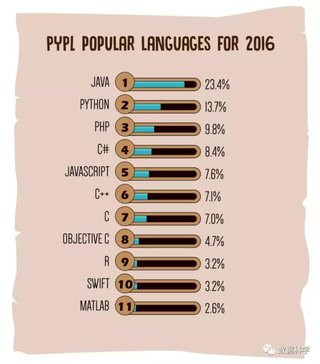 PYPL(编程语言流行指数)依据 Google 上关于语言教程的搜索频率进行统计。从全球搜索引擎流行度来看,Java 依然是大赢家;Python 较之前五年排名提升 6.8%,而 PHP 暴跌5.0%。