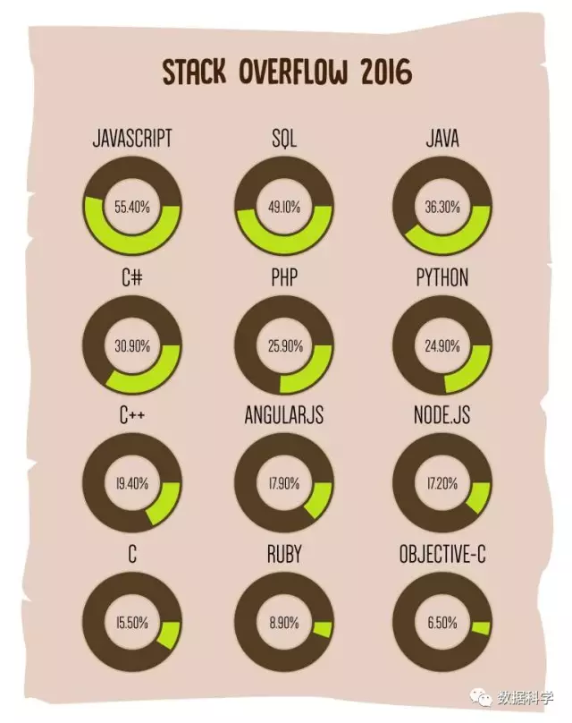 Stack Overflow 是一个问答平台。它有超过400万的用户,问答了1000多万个问题。根据问题情况,Javascript 的使用者比其他语言的都要多。另外,与 Node 和 Angular 相比,PHP 排名有所下滑。