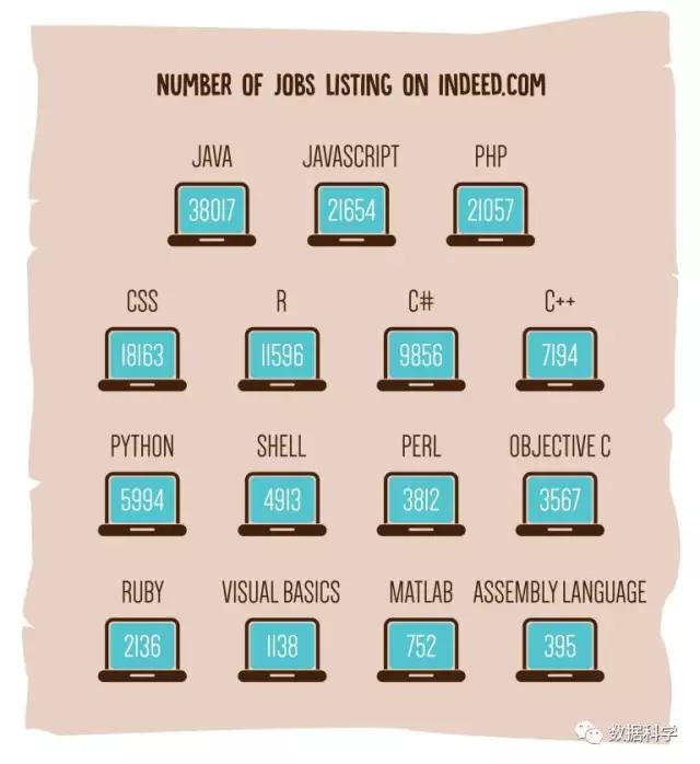 Indeed 是美国最高流量的工作网站之一,可在50多个国家使用,支持28种语言。按照使用量排名,Java 排在第一位,Javascript,PHP 和 C 以一万多的差距尾随其后。令人惊喜的是,R 语言也出现了竞争的势头。